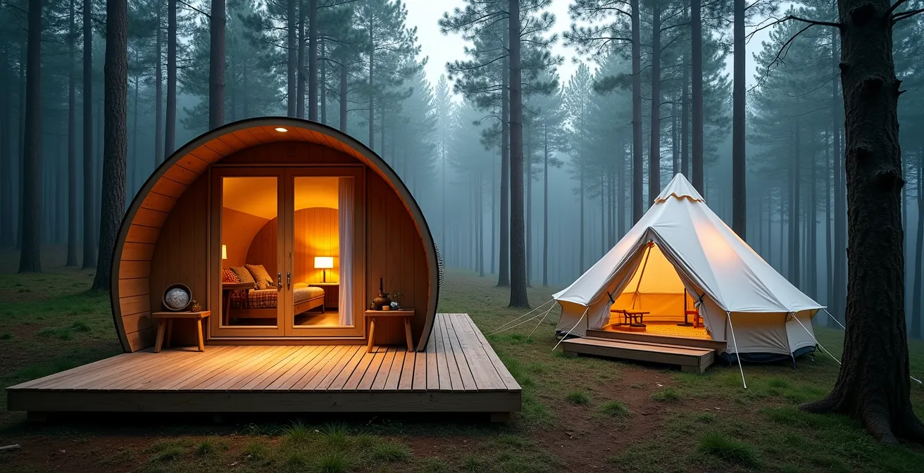 - Die Wahl der Bauweise ist entscheidend für die Privatsphäre: Massive Strukturen wie Baumhäuser oder Pods bieten eine deutlich bessere Schallisolierung als jede Zeltform.